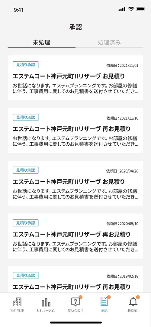 お見積の承認など煩雑な作業もワンタップで完了。処理状況も把握できるので漏れなく安心です。