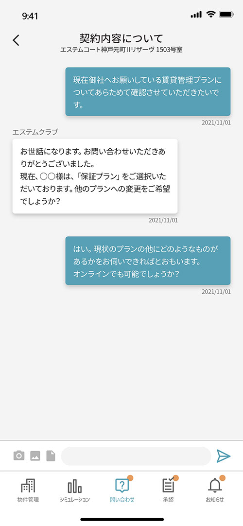 お問い合わせはチャット形式で。すぐに連絡ができ、案件ごとに内容を把握できます。