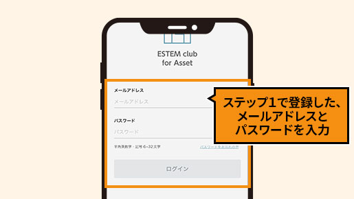 再度、「エステムクラブ」アプリへ戻り、「step.01」で登録した「メールアドレス」と「パスワード」でログインを行ってください。